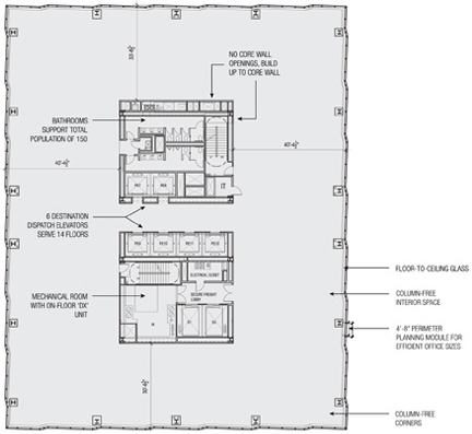 4’8’’ planning curtain wall module provides for efficient office sizing