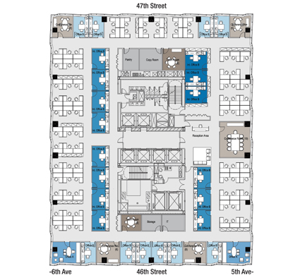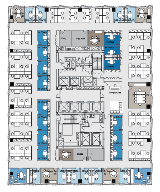 Test Fit: Service Click to enlarge image Test Fit: Service Program/Quantity Office A (225 Sq. Ft.) / 2 Office B (118 Sq.Ft.) / 10 Interior Office B (3’-0’’ x 5’-6’’) / 14 Workstations (6’-0’’ x 6’-0’’) / 74 Total Staff 100 Conference Room (10) / 1 Conference Room (6) / 6 Total Seats 46 RSF ‐ 22,500 RSF per seat - 225
